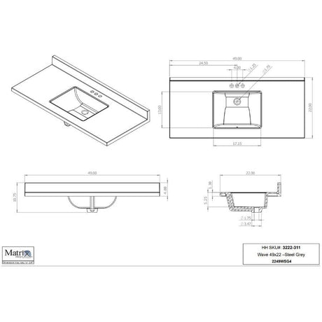 49" x 22" Cultured Granite Vanity Top with Rectangular Wave Sink - Grey