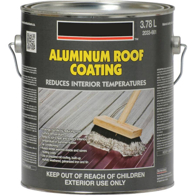 Due to its unique thermal qualities, it can help decrease heating and air conditioning costsDesigned as a roof insulatorCan be used on barns, mobile homes, garages, offices, industrial buildings and factoriesThe type of roof systems included for application are built up asphalt, tar, prepared roll roofing, weatherized iron and tinEconomical product which can be used to reflect the damaging ultraviolet rays of the sunNot recommeded over flood coats or glaze coats of asphalt for one year after applicationNot recommended over fibered roof coatings for one yearCovers approximately 7 - 28 sq. m (75-300 sq. ft.) per 4L (gallon)Apply liberally, brushing in one direction onlyDo not lapOver brushing will interfere with leafing action of the aluminum
