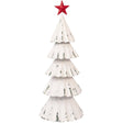 This distressed metal art Christmas tree is a perfect feature for any tabletop or space in your home. The white distressed metal and red star is a tasteful way to add a rustic holiday feel to your space.