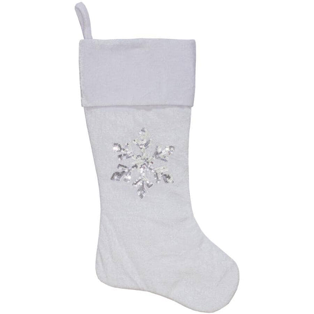 Carry on Christmas tradition by hanging this 20 Inch stocking with your holiday décor. It features a silver snowflake on a white velvet background.