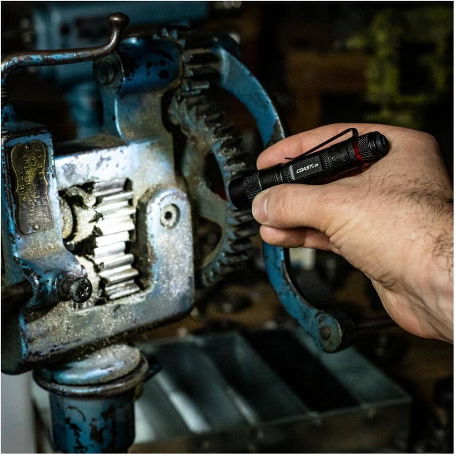 Carry close, see far. The G22 flashlight, unique among COAST pen lights, features a fixed BULLS-EYE™ Spot Beam and pocket clip to combine clip-and-carry convenience with longer-range viewing. Maxing out at 100 lumens, the two-mode beam from this sleek frame reaches 55 meters (180 feet) with a hotspot at the center and a surrounding halo of softer light to expand the viewing area. The G22 measures 4 inches long and less than one ounce—combining ultimate portability with ultra-durable construction. Made from top-grade aluminum, this go-everywhere pen light is IP54 storm proof and dust resistant, ready to shine in any weather.