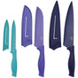 Prep-work in the kitchen is easy and enjoyable when using this three-piece knife set. The set is composed of an 8" chef knife, 7" santoku and a 5" utility knife. Each knife is equipped with a 3Cr14m stainless-steel blade with a non-stick coated blade. Each handle is constructed of durable ABS and is colour matched to the blade. Each knife comes with a sheath for storage. A great addition to any home.