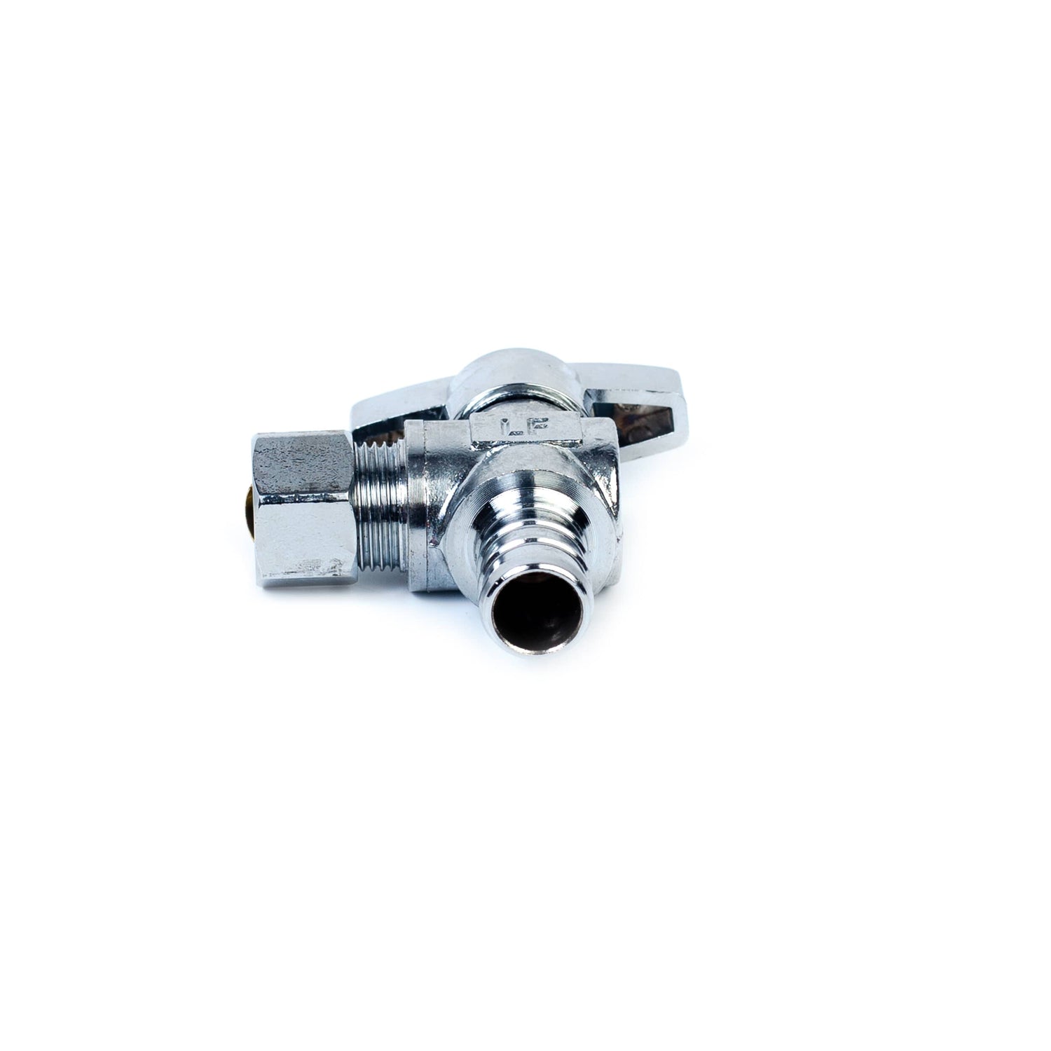 The Waterline 1/2" PEX x 3/8" compression angle stop quarter-turn valve controls water flow to household plumbing fixtures. The angle stop valve is used where the water pipe enters the room to allow for easy shut-off of water flow to the end fixture allowing for maintenance and repair without having to turn water off to the entire home. The Waterline 1/2" barb end can be connected to PEX pipe using copper crimp rings or stainless steel clamps. The 3/8" compression outlet with the supplied ferrule and compression nut, can be used with 3/8" pipe or 3/8" supply line. This valve is best suited for use on toilets, faucets, and dishwashers.