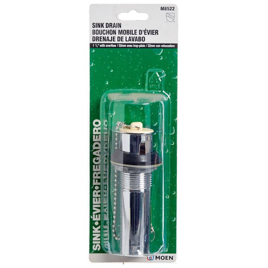 Sink Drain - with Overflow Opening + Chain & Stopper, Chrome Plated Brass
