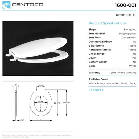 Elongated Plastic Toilet Seat - with Closed Front, White