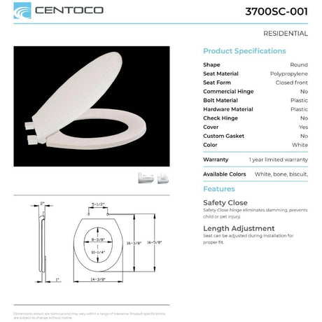 Round Plastic Toilet Seat - with Closed Front + Slow Close, White