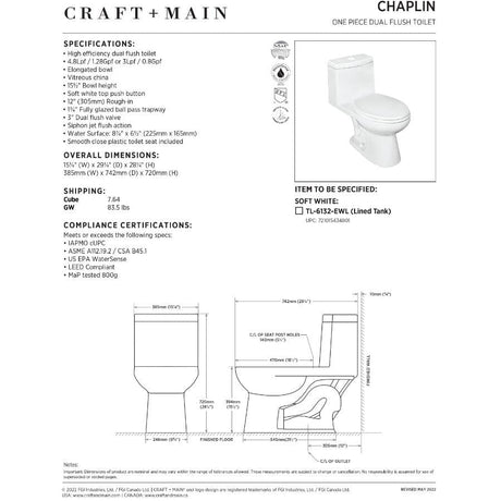 3 L/4.8 L Chaplin High Efficiency Dual Flush Elongated Toilet - White
