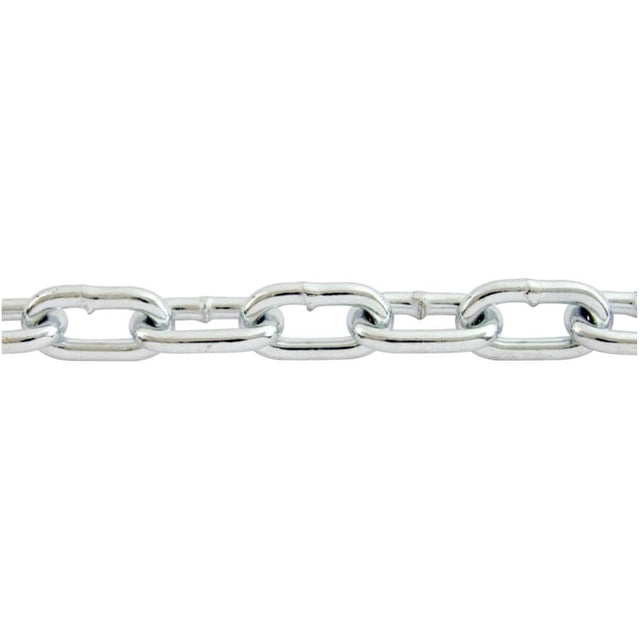 KingChain® Grade 30 chain is an excellent general purpose, low carbon utility chain. The chain is manufactured to NACM standards. Each link is proof tested 2x and the break load is 4x the Safe Work Load (design factor 4:1). It is recommended for applications that do not require high strength-to-weight ratios. Often used on farms, in industry and at home for general purpose applications, such as pulling stumps, lashing cargo, truck tailgates and guard rails. Chain is zinc plated for a bright, attractive finish with moderate corrosion resistance. Safe Work Load (SWL) of 800 lb (364 kg). Never exceed the Safe Work Load (SWL). **NOTE** Do not use for overhead lifting.