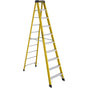 The Featherlite 6900 is an extra-heavy duty fibreglass stepladder series that meets or exceeds CSA Grade 1A, ANSI Type 1A criteria. This 10' ladder features durable non-conductive "C" channel side rails in high visibility safety yellow; copolymer utility top for strength and durability; wide 3″ slip-resistant serrated aluminum steps for safe climbing; inside spreader arms that are protected during storage/loading/transit; full rear "L" horizontal struts, top and bottom struts reinforced with Zinc coated steel diagonal braces; reinforced with Zinc coated steel diagonal braces at top and bottom steps; and PVC rubber safety boots that are heavy duty and provide rail protection and slip-resistance. This ladder has a weight rating of 300 lbs.