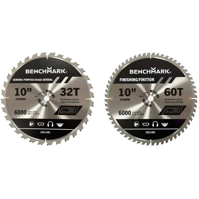 This Benchmark 2 pack of 10" circular saw blades provide general purpose and finishing applications in one convenient set. Stamped expansion slots with copper inserts are designed to disperse heat and prevent blade deformation caused by overheating. Durable carbide tips and ATB (Alternate Top Bevel) grind produce clean, accurate cuts.