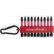Benchmark Impact Rated Insert Bits are constructed of precision tolerance, heavy duty hardened S2 tool steel and a Shock Absorbent Zone for heavy duty use. The precision design reduces stripping and resists corrosion. Flex zone core absorbs peak torque, allowing bits to flex and reduce breakage. Set contains handy bit holder and carabiner clip to keep bits close.