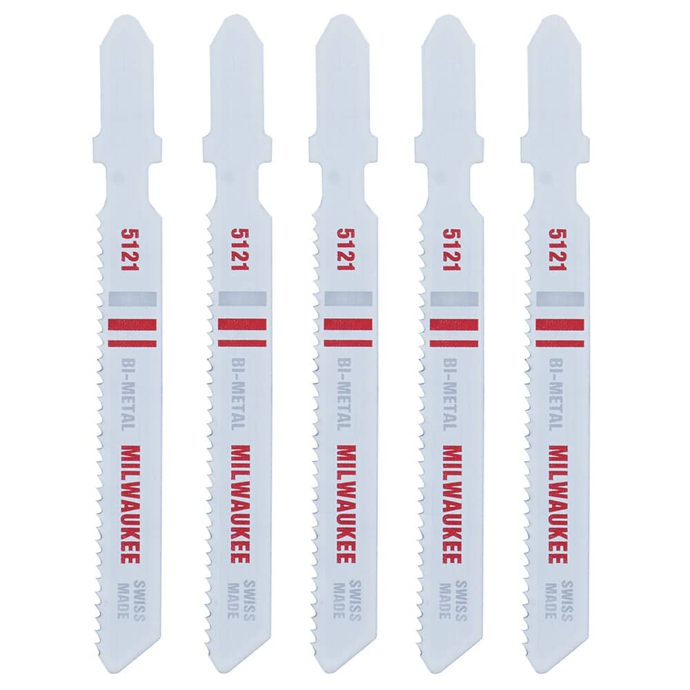 Milwaukee® T-Shank Bi-Metal Jig Saw blades are designed and manufactured for the professional user. Bi-metal blades last longer than high speed steel or carbon blades. Detail to the material used, tooth shape and sharpness make these blades cut clean, fast, and have a longer life. This blade uses a T-Shank design and fits Milwaukee Jig Saws and other popular brands. Includes 5 individual blades.