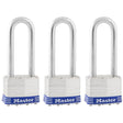 The Master Lock No. 1TRILJ Laminated Padlocks feature a 1-3/4” (44 mm) wide laminated steel body for maximum strength and reliability. The 5/16” (8 mm) diameter shackle is 2-1/2” (51 mm) long and made of hardened steel, offering extra resistance to cutting and sawing. The 4-pin cylinder prevents picking and the dual locking ball bearings provide resistance against prying and hammering.