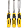 The Stanley 3-piece chisel set includes a 1/2”, 3/4”, and 1” chisel perfect for woodworking, each featuring hardened and tempered chrome carbon steel blades for superior edge retention. The short-series blades are ideal for strength and control during use, and the handles, constructed from polypropylene, are ergonomically designed for safety and comfort. Each chisel comes with a blade protector, with the option for wall mounting for storage.