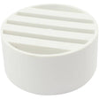 Installed in a PVC white sewer hub open at floor level, to allow water to flow into the sewage drainage system but prevent debris or vermin from entering.