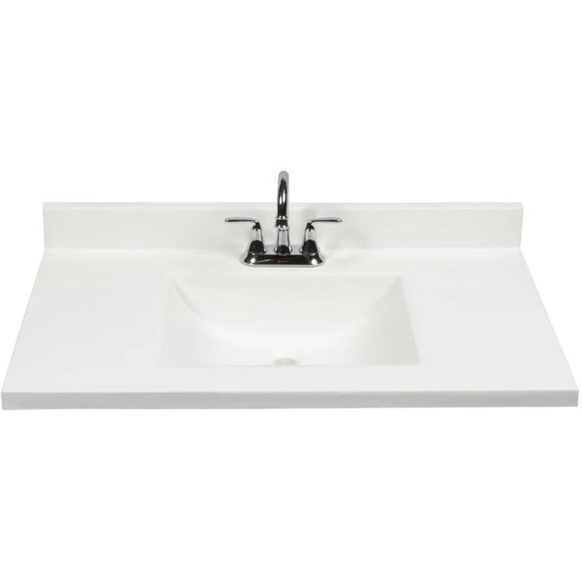 This stylish cultured marble vanity top features an integral on trend rectangular bowl, a built-in overflow system, as well as a 4" backsplash to preserve your bathroom wall. It has a one-piece construction so there is no seam between the top and bowl to collect dirt, making it easy to clean. With a gloss finish, this white vanity top brings a cool texture to your bathroom's décor while also fulfilling your everyday functional needs.