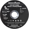 Benchmark premium metal cut-off discs are designed for cutting sheet metal and roof decking. Thinner design minimizes the surface area contact between the material and the cut-off wheel for faster, cleaner cuts. The tough aluminum oxide abrasive is continuously exposed during use to maintain an aggressive cutting edge.