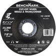 Benchmark metal cut-off discs with depressed center wheel, provide excellent performance leading to improved productivity. Designed with a resin bonded aluminum oxide abrasive, for fast material removal and extra-long cutting life. Ideal for use when working in hard-to-reach areas.