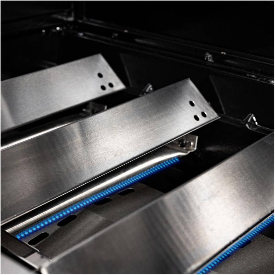 The Flame 440 from Sterling® is a versatile full-sized grill for those who enjoy cooking with family and friends. Featuring a 40,000 BTU stainless steel burner system, a stainless steel vapourizer system for rich barbecue flavour and even heat distribution and cast-iron cooking grids for perfect steakhouse sear marks. The 600 sq in total cooking surface includes a porcelain-coated warming rack, creating more cooking space. The 12,000 BTU sear burner features a diamond patterned cast iron grid for incredible searing performance. The 10,000 BTU side burner expands the cooking versatility of your grill, perfect for preparing savoury side dishes, soups, and sauces. The grill is finished with a black painted frame, enclosed cabinet, a fully welded stainless steel lid, stainless steel control panel, and stainless-steel shelf fascias for long-lasting durability and a modern, contemporary design.