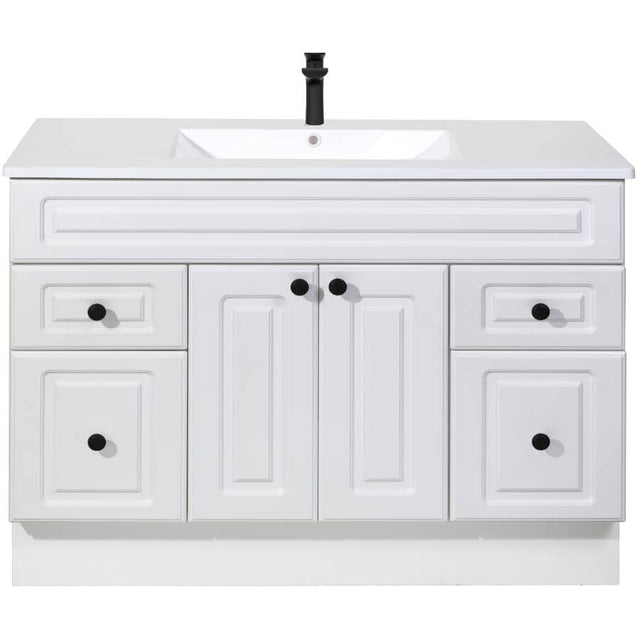Enhance your bath or powder room with one of our transitional Halifax vanities. This 42-inch (2) doors and (4) drawers Halifax vanity is built with soft-closing mechanism to eliminate slamming, creating quiet morning. Wrapped in a white polymer finish accented by matte black hardware each Halifax vanity base includes a matching white cultured marble vanity top with integrated basin, drilled for a single-hole faucet. Simply add your choice of faucet to suit your personal style.
