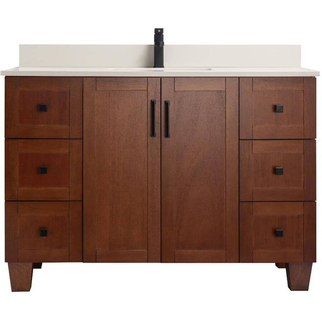Our mid-century modern Madera collection provides a warm and inviting atmosphere to any bathroom. This 48" (122 cm) vanity, with its rustic wood-stained finish, mahogany veneers and solid wood legs, is accented by industrial black hardware pulls and a white, 2 cm quartz countertop. Spacious storage, MDF/plywood construction and soft-closing doors ensure practicality is not compromised by style.