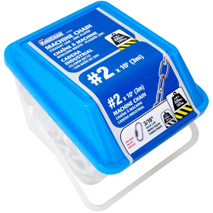 KingChain® Zinc Plated Straight Link Machine Chain is a low carbon steel, electronically welded chain that is not heat-treated. It has shorter links that make it very flexible and particularly well suited for agricultural applications, guard rails, tailgate chains, door chain and playground equipment. Safe Work Load of (SWL) 325 lb (147 kg). Never exceed the Safe Work Load (SWL). **NOTE** Do not use for overhead lifting.