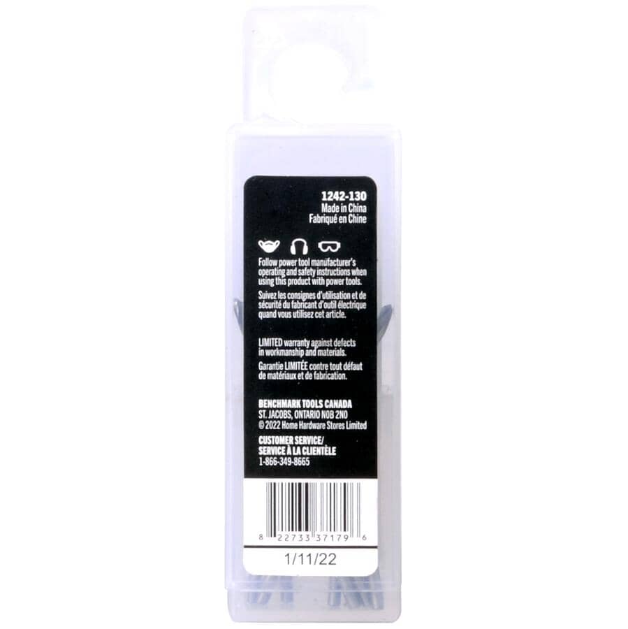 Benchmark drill bits are constructed from premium high-speed steel and ground from solid steel for maximum performance. 135 degree split point allows for a precision start without bit walking. Best when drilling metal, wood, and plastic.
