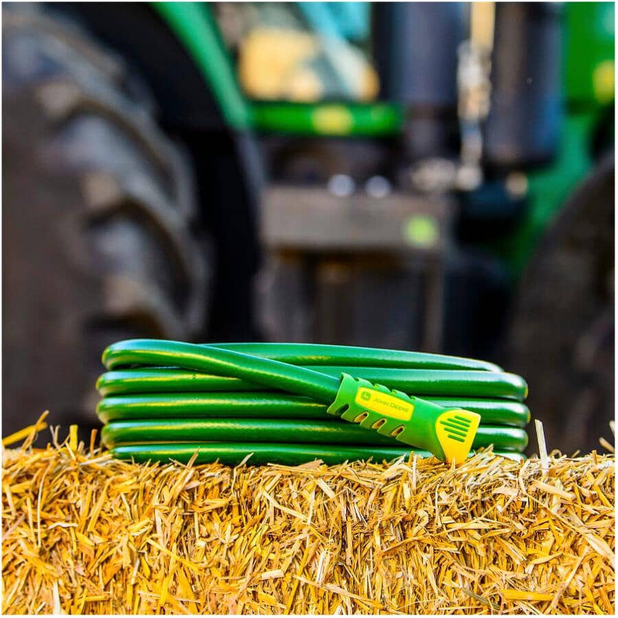 Designed in the iconic colours of the John Deere brand, the John Deere Garden Hose is one of the first garden hoses to feature Swan’s new CoreFUSION™ Technology, a major advancement in garden hose functionality that makes a garden hose kink-free. CoreFUSION™ Technology uses Swan’s patent pending co-extrusion process to add strong rods of a unique compound throughout the entire length of a garden hose’s interior wall to reinforce it. These proprietary rods then cause the garden hose to bend only so far in any direction, eliminating the kinks that cut off water flow.