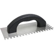 This HOME ESSENTIALS 9" x 4" square notched trowel with a 1/4" x 1/4" x 1/4" notch size is commonly used in tile installation for spreading thin-set mortar or adhesive onto surfaces before laying tiles.