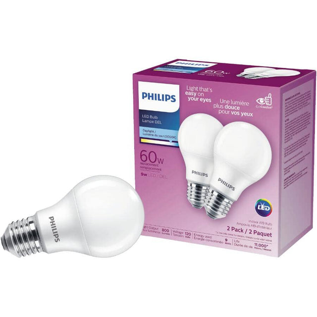 Philips LED 9W (60W equivalent) household bulb. Energy savings and long life. Provides a light similar to natural daylight, creating a cool and refreshing environment. Instant-on, delivering beautiful, consistent light. The A19 shape is similar size and shape as a traditional incandescent bulb. Emits virtually no heat and will not fade fabrics or furnishings. Ideal for table and floor lamps.