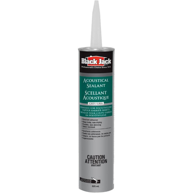 Black Jack Acoustical Sealant is a blend of synthetic rubber polymers formulated primarily to bond polyethylene vapour barrier sheeting. It has excellent adhesion to common construction surfaces. May also be used as a bedding compound over vibrating elements, electrical boxes or other items recessed or passing through walls. Black Jack Acoustical Sealant should only be used in concealed areas.