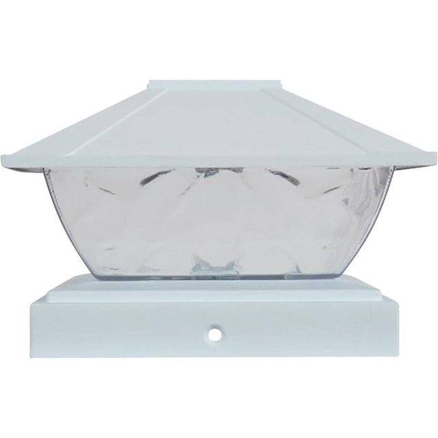 This brilliant white hammered solar post cap adds a touch of white light to any outdoor space. This post cap includes the mounting hardware and adaptors to fit 4”, 4.5” or 5” posts. Create a breathtaking oasis with this Solar Fence Post Cap.