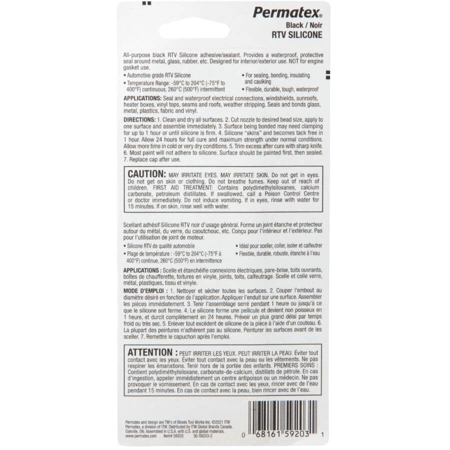 Low odor formula. General-purpose, black RTV silicone sealant. Seals, bonds, repairs, mends and secures glass, metal, plastics, fabric, vinyl, weather stripping and vinyl tops. Protects and repairs electrical wiring. May be applied to horizontal or vertical surfaces. Waterproof and flexible. Temperature range -75°F to 450°; resists water, weather and vibration. Not recommended for windshield installation.