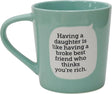 Express your wit with the Broke Daughter Mug from Our Name is Mud. This vibrant blue mug features a clever speech bubble highlighting the humorous social and financial realities of raising a daughter.