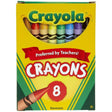 Vibrant, classic crayons. Robust colour assortment of true hues and intense brightness in primary and secondary colours. Double wrapped for extra strength and durability. This Crayola pack includes Red, Blue, Yellow, Black, Brown, Orange, Purple and Green colours, and is a great addition to your child's art supplies
