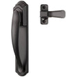 The DX storm door pull handle with backplate and locking inside latch set complements a wide range of decor styles. This elegant and easy-to-operate handle can replace a push-button handle that may be on your screen door. The interior latch features an easy-open push movement and features a thumb style lock or night latch which allows the storm door to be locked from the inside. For added security, an add-on deadbolt (SK5) and a keyed deadlock (SK703) are available. This handle will replace all storm and screen door handles that have 1-3/4” distance between the screw posts. The set will fit storm doors or screen doors 1” to 2-1/8” thick. You may need to drill one small hole on the outside face of the door to secure the backplate.