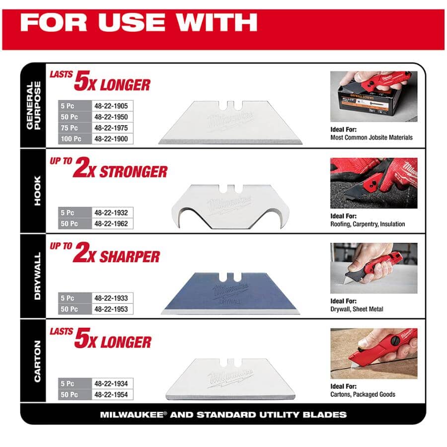 The Milwaukee® FASTBACK™ folding utility knife features a press and flip mechanism for easy, one-handed opening. The Milwaukee FASTBACK™ folding utility knife allows for making quick, tool-free blade changes for maximum job site efficiency. The utility knife has an all-metal body, an integrated gut hook and a wire stripper for increased versatility. The folding utility knife is equipped with a durable wire belt clip to reduce pocket tearing and a blade holder designed for scoring. The folding utility knife has a metal extension that prevents accidental blade removal and a lanyard hole for convenient tethering.