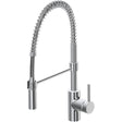 This professional spring style pull-down kitchen faucet in chrome finish enhance any modern kitchen décor. Sleek dual function sprayer allows to quickly switch between aerated or spray water stream. Features easy to install above counter top mount structure, an option deck plate and a durable drip-free ceramic disc cartridge.