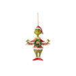 This detailed Jim Shore ornament showcases The Grinch joyfully dressed in a Santa suit and hat, holding a "Merry Christmas" banner adorned with a festive wreath. Perfect for collectors and fans alike, it celebrates the season with an iconic character design.