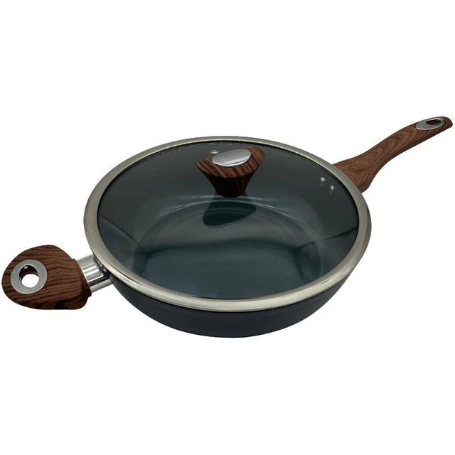 Create mouth watering meals in style with the 11” Deep Frypan from the Grove Collection. This piece will add a touch of elegance to your cookware collection. With a ceramic coating to prevent sticking during cooking, this frypan also features a modern wooden look handle that stays cool as you cook up a storm in the kitchen. Pair it with more pieces from the stylish Grove collection to complete the look.
