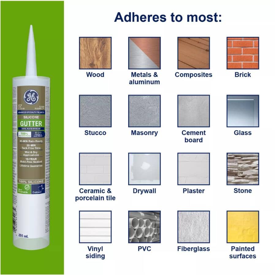 GE Gutter Silicone 2 sealant is a high-performance, 100% silicone and 100% waterproof sealant that’s ideal for use on metal and vinyl gutters. This versatile sealant is also suitable for other exterior applications such as siding, down spouts, and vents. Our 30-minute rain-ready formula offers permanent flexibility and excellent durability, and it comes with a 10-year mould-free product protection to keep mould and mildew growth in check. Plus, our gutter sealant is tough enough for your outdoor jobs since it’s resistant to freezing, shrinking, cracking, and sunlight. GE Gutter Silicone 2 Sealant provides the absolute best leak protection and saves you time and money on repairs and new installations. It adheres to wet and dry surfaces, including PVC, wood, aluminum, copper, vinyl, asphalt, concrete, cement, and more.
