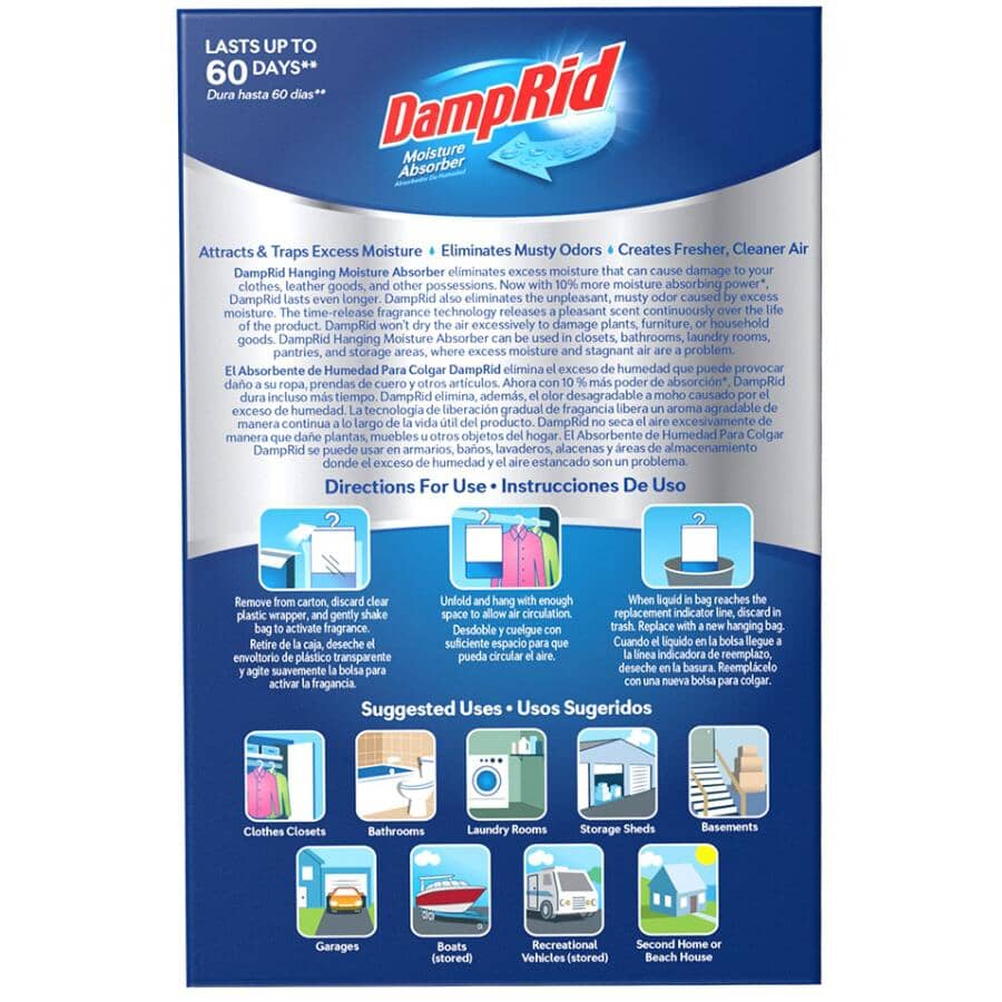 DampRid Hanging Bag Moisture Absorber attracts and traps excess moisture. The time-release fragrance technology releases a pleasant scent continuously over the life of the product. The hanging bag design is perfect for closets, laundry rooms, and storage areas where clothes often collect unpleasant odors. DampRid lasts longer to absorb excess moisture, creating and maintaining the optimal humidity level wherever moisture is a problem. Each dehumidifying bag can last up to 60 days depending on the level of humidity and temperature. When the bag is finished, discard and replace. Not for use in moving vehicles. Keep out of reach of children. Read & follow all label directions.