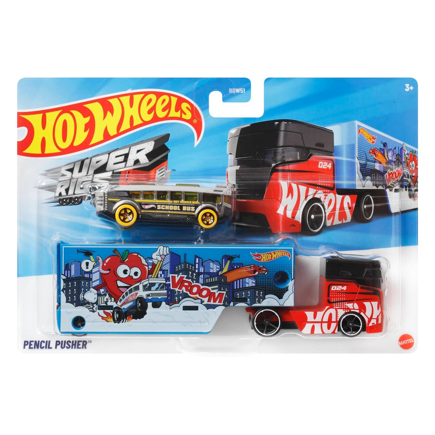 These cool sets feature a Hot Wheels hauling rig with one 1:64 scale car to deliver inspiring ways to play - push around, load and go or hit the track for racing thrills! Each semi transporter comes with a sports car and features big action fun and dynamic detailing. There are many radical rig models to choose from, so pick a favorite then load up and hit the road for new, powerful adventures. Each sold separately, subject to availability.