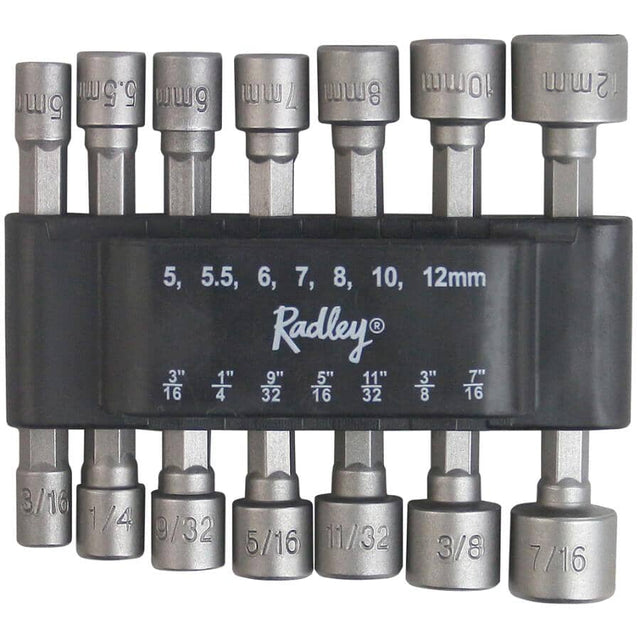 This Radley Impact Nut Setter Set includes bits sizes in both Metric and SAE up to 7/16” and 12 mm. Convenient holder fits on users’ belt when driving hex nuts or self-tapping screws.