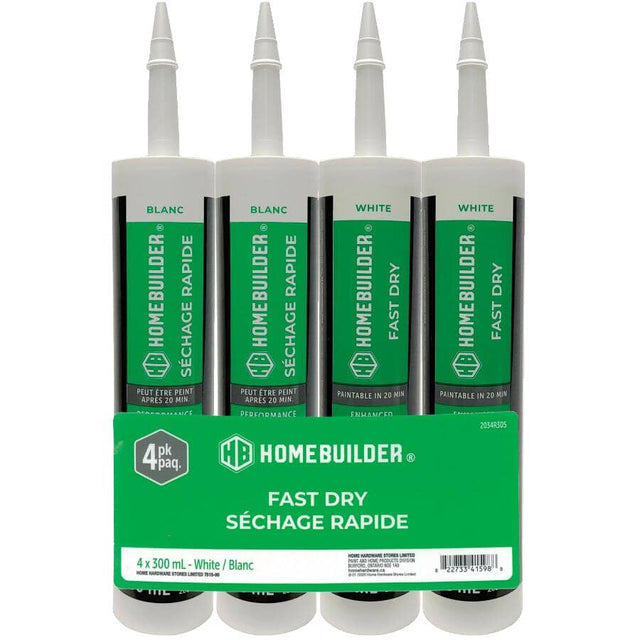 Home Builder Fast Dry Caulking is paintable in 20 minutes and provides long lasting protection and energy savings. Flexible even in extreme cold temperature. Ideal for use around interior/exterior windows and doors, exterior siding, exterior openings, woodwork, trim and fixtures. Formulated for the Canadian climate.