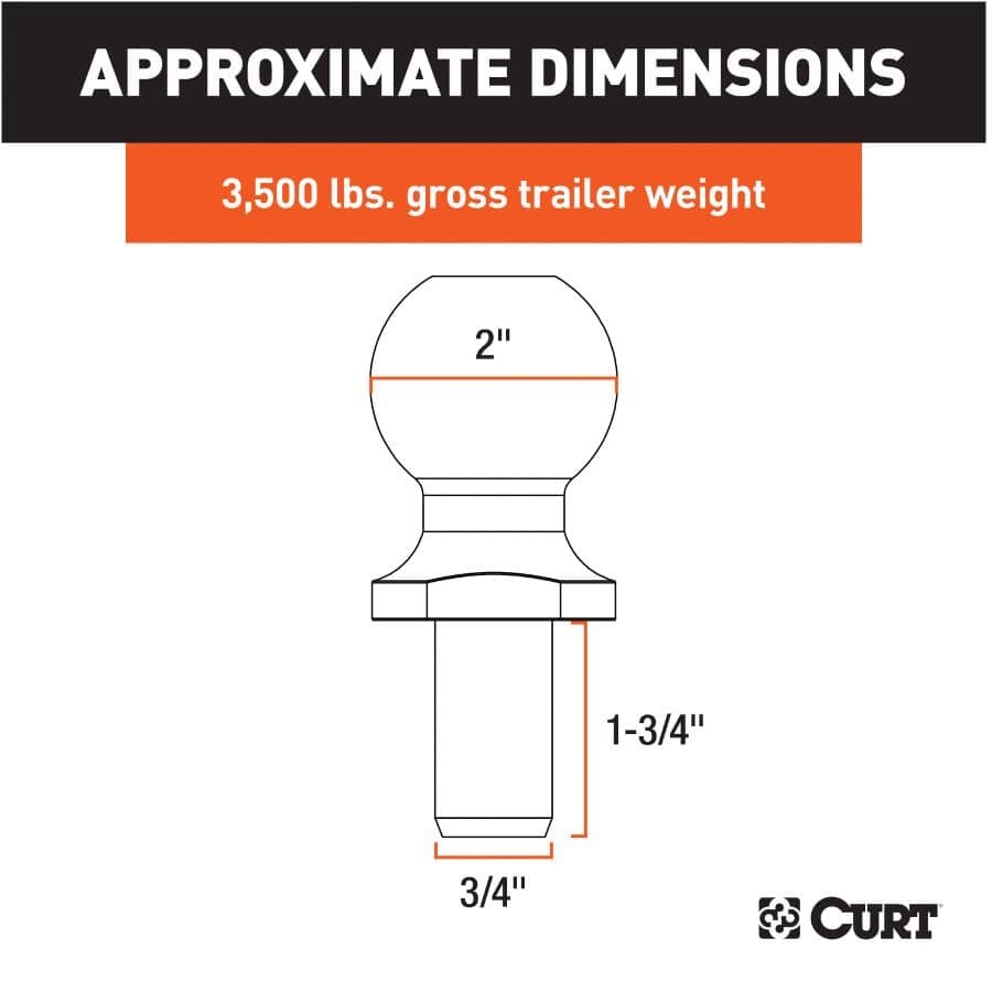 Out of the monotony comes one name that rises above all others. CURT trailer balls are designed for strength, ease of use and, ultimately, to get you to your destination without hassle. CURT 2" trailer hitch balls are constructed from quality steel and are made with precision to fit your 2" trailer coupler like a hand in a glove. They are able to tow most standard-duty and heavy-duty trailers such as utility trailers, boat trailers, campers, livestock trailers and recreational vehicle trailers for hauling ATVs, snowmobiles, personal watercraft and more. These tow balls are an excellent extension of your class 3 or class 4 trailer hitch and ball mount, and are the ideal choice for most pickup trucks and SUVs (NOTE: Never exceed the lowest weight capacity of any towing component, i.e., the vehicle, hitch, trailer, etc.).This particular 2" trailer ball offers a ball capacity of 3,500 lbs. It features a 3/4" shank diameter, a 1-3/4" shank length, 0" of rise and a nickel-chrome finish to protect against rust and scratches. With its fine-threaded shank, this 2" trailer ball also offers an added measure of holding strength and provides smooth installation and torquing. To give you peace of mind while towing to that next destination, we also carefully test our trailer balls and ensure that each one meets U.S. VESC specifications.