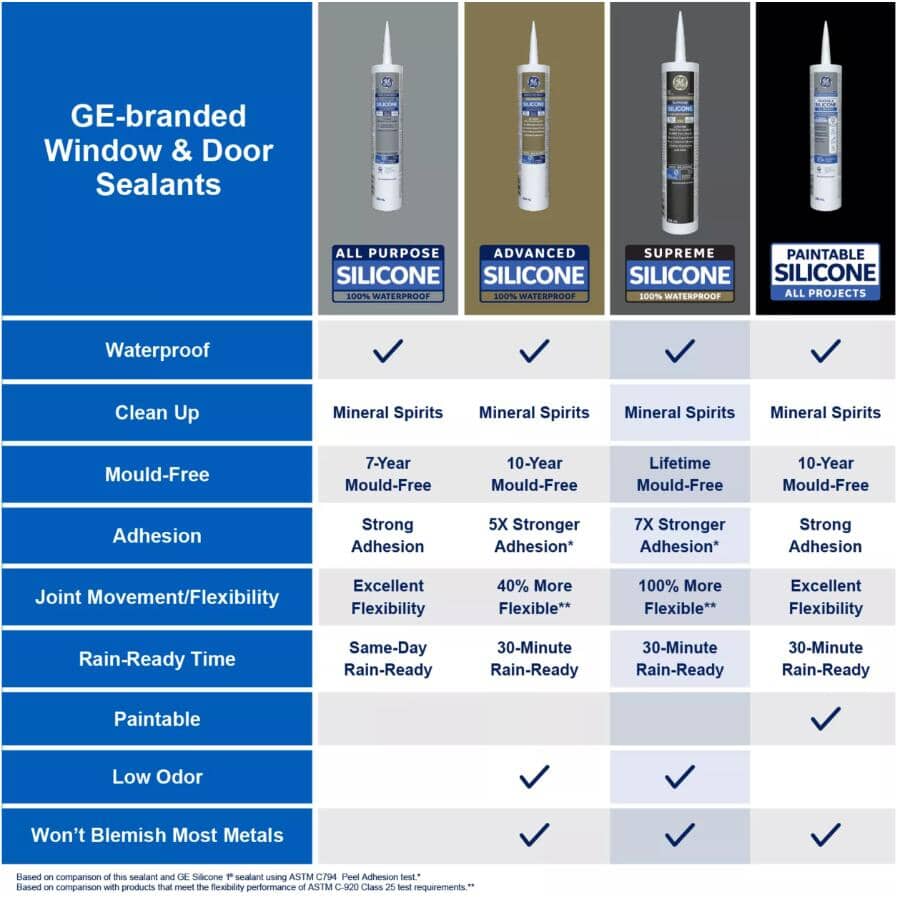 GE Supreme Silicone Kitchen & Bath sealant is a premium, 100% silicone and 100% waterproof sealant ideal for areas that are constantly exposed to moisture—especially those in the kitchen and bathroom. Our sealant also has a 30-minute water-ready formula and resists stain-causing mould and mildew growth. This silicone sealant offers 100% more flexibility than Class 25 sealants and 7X stronger adhesion than our Silicone 1 sealant. Plus, GE Supreme Silicone Kitchen & Bath sealant offers 50% joint-movement capabilities without cracking or shrinking. Our sealant has a low odour that’s ideal for interior applications, and it won’t discolour most high-end metal finishes such as chrome, bronze, and nickel.