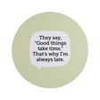 Brighten your workspace with the Late Mouse Pad from Our Name is Mud. Featuring witty, sarcastic humor, this light green pad playfully declares, “Beauty can't be rushed,” offering a clever excuse for tardiness. Its unique design adds personality and attitude to your desk while providing a smooth surface for precise mouse control. Ideal for anyone who appreciates fun, functional office accessories that spark a smile.