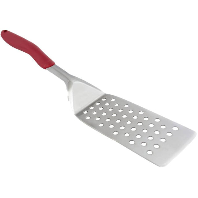 Polished stainless steel turner with an ergonomic soft grip grey handle and red accents. The extra long blade is great for larger grilled items, two burgers at a time, or a grilled fish.