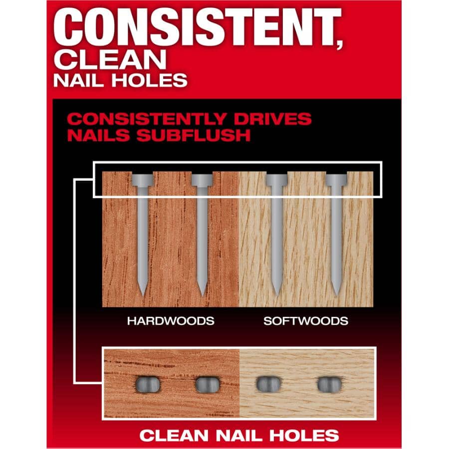 The MILWAUKEE® M18 FUEL 18 Gauge Brad Nailer delivers peak productivity at the jobsite. Leveraging a nitrogen air spring mechanism, the finish nailer enables users to consistently sink nails to the proper depth in hard and soft woods while leaving clean nail holes matching the head of the nail. The combination of Milwaukee's POWERSTATE Brushless Motor and REDLINK PLUS Intelligence delivers users with unmatched fire rate with zero ramp-up time keeping them efficient throughout their day. Additionally, the cordless brad nailer operates using Milwaukee's REDLITHIUM Batteries (not included) and sealed compressed nitrogen to drive each nail, completely eliminating the cost of gas cartridges and maintenance associated with competitors nailers. The 18 gauge nailer is compact in size, and very lightweight, and delivers the pneumatic performance that professional carpenters and remodelers expect with the freedom and convenience of cordless.